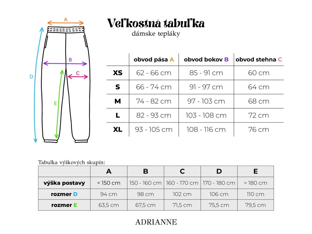- Pomocou tabuľky výškových skupín priraďte svoju výšku k výškovej skupine A-E. Tepláky prispôsobujeme na Vašu výšku, preto je tento údaj NEVYHNUTNÝ!